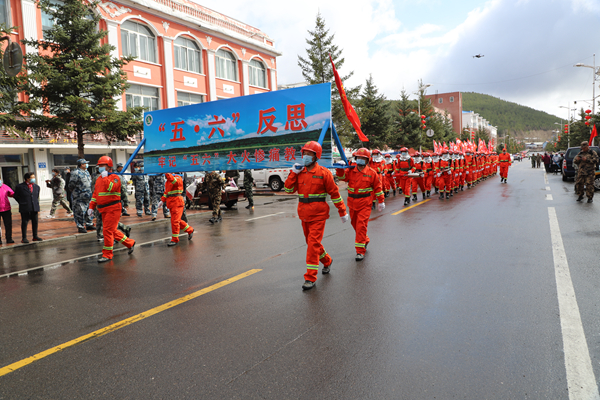 9時(shí),反思活動(dòng)正式開始。林業(yè)局處級(jí)領(lǐng)導(dǎo)與職工群眾鄭重地在在“牢記歷史 汲取教訓(xùn) 振奮精神 開拓進(jìn)取 建設(shè)美麗藍(lán)莓小鎮(zhèn)”宣傳條幅上,鄭重地簽上了自己的名字。并舉行了聲勢(shì)浩大的人員游行、車輛游行。由運(yùn)兵車、運(yùn)兵車、人工增雨車等26臺(tái)特種車輛,拉響警報(bào),緊跟在由森林消防大隊(duì)組成的100余人步行方陣后,他們身穿防火戰(zhàn)斗服,手舉寫有“‘五?六’反思”巨型防火宣傳牌和防火宣傳彩旗,尤其是手執(zhí)高速渦流噴射滅火機(jī)、脈沖槍、斯蒂爾風(fēng)力滅火機(jī)的隊(duì)員,邁著整齊的步伐,喊著響亮的口號(hào),立即吸引了過往的居民的注意,成為最亮眼的“明星”。