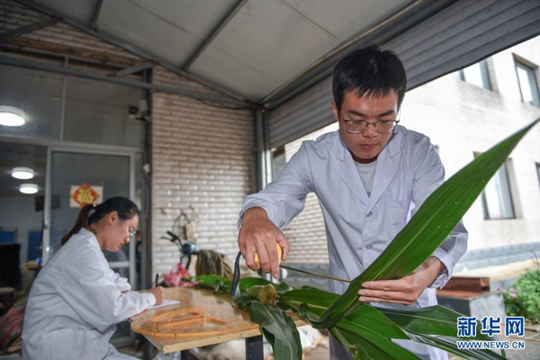 8月2日,在吉林省梨樹縣四棵樹鄉(xiāng)三棵樹村“科技小院”,中國農(nóng)業(yè)大學博士研究生沙野(右)和在讀碩士郭雯清測量、記錄玉米植株樣本。