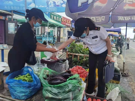 執(zhí)法人員現場發(fā)放《黑河市市場監(jiān)督管理局食品安全“你點我檢”調研問卷》46份,并根據調研問卷統(tǒng)計結果隨機抽取大集上售賣的熟食、水果、蔬菜等樣品。