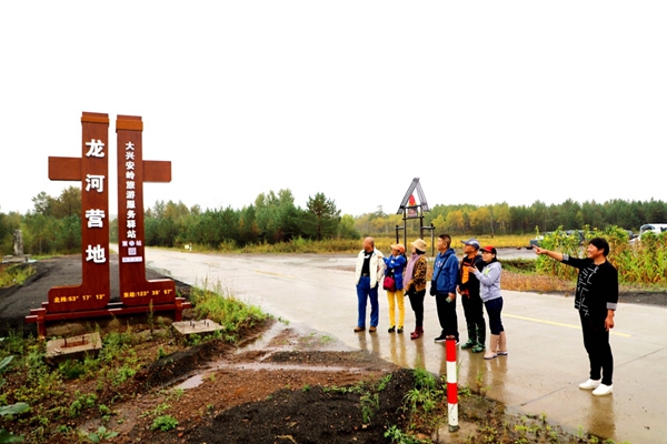 阿木爾林業(yè)局職工、微商何喜燕(右一)向粉絲介紹龍河林場旅游地標