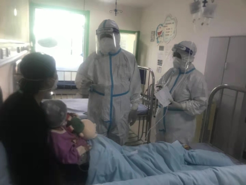 9月29日,科主任邸順祥和護(hù)士長(zhǎng)閆秀彬共同進(jìn)入醫(yī)學(xué)留觀(guān)病區(qū)進(jìn)行日常查房。查房進(jìn)行到中午發(fā)熱門(mén)診迎來(lái)了一位特殊患兒,這是一例確診病例的第一密切接觸者,家屬均被隔離,由于突發(fā)疾病由集中隔離點(diǎn)的醫(yī)護(hù)人員乘專(zhuān)門(mén)車(chē)輛護(hù)送至發(fā)熱門(mén)診。邸順祥主任坐鎮(zhèn)指揮,閆秀彬護(hù)士長(zhǎng)配合消毒,等待最終結(jié)果。當(dāng)患兒核酸檢測(cè)結(jié)果回報(bào)陰性,除外新冠病毒感染,經(jīng)由集中隔離點(diǎn)人員按規(guī)定接回時(shí),醫(yī)護(hù)人員們?cè)卺t(yī)學(xué)留觀(guān)區(qū)已工作了5小時(shí)。
