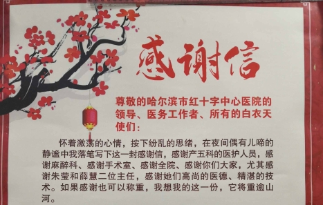 黑龍江經(jīng)濟(jì)網(wǎng)訊(孫麗霞 葉鴻 梁新立)“懷著激蕩的心情,按下紛亂的思緒,在夜間偶有兒啼的靜謐中我落筆寫下這一封感謝信……如果感謝也可以稱重,我想我的這一份,它將重逾山河?!苯?,哈爾濱市紅十字中心醫(yī)院(哈爾濱醫(yī)科大學(xué)附屬哈爾濱婦產(chǎn)醫(yī)院)產(chǎn)五科收到了來(lái)自患者家屬李先生的一封感謝信和一面錦旗。