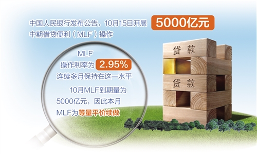 10月15日,月中“麻辣粉”(MLF)如期端出。中國人民銀行發(fā)布公告稱,為維護(hù)銀行體系流動(dòng)性合理充裕,15日開展5000億元中期借貸便利(MLF)操作(含對(duì)10月15日MLF到期的續(xù)做)。MLF操作利率為2.95%,與9月持平,并連續(xù)多月保持在這一水平。10月MLF到期量為5000億元,因此本月MLF為等量平價(jià)續(xù)做。