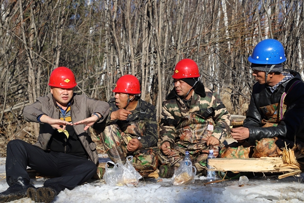 阿木爾林業(yè)局多種經(jīng)營公司黨支部書記、經(jīng)理孫乃彬(左一)同職工一起邊吃飯邊研究下步修橋工作。