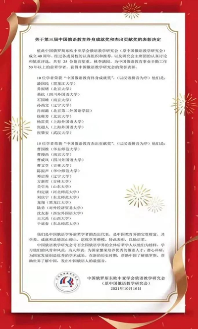 今年恰逢黑龍江大學(xué)建校、黑龍江大學(xué)俄語(yǔ)學(xué)院建院80周年。八十年來(lái),眾多德才兼?zhèn)涞膬?yōu)秀教師為黑大俄語(yǔ)專業(yè)建設(shè)、為中國(guó)俄語(yǔ)教育事業(yè)發(fā)展貢獻(xiàn)了畢生力量。李錫胤教授、華劭教授與張家驊教授曾獲“中國(guó)俄語(yǔ)教育終身成就獎(jiǎng)”,鄭述譜教授與金亞娜教授曾獲“中國(guó)俄語(yǔ)教育杰出貢獻(xiàn)獎(jiǎng)”。此次潘國(guó)民教授與龍翔教授榮獲表彰,再次肯定了黑龍江大學(xué)老一輩俄語(yǔ)教師對(duì)國(guó)家俄語(yǔ)教育事業(yè)發(fā)展做出的突出貢獻(xiàn)。