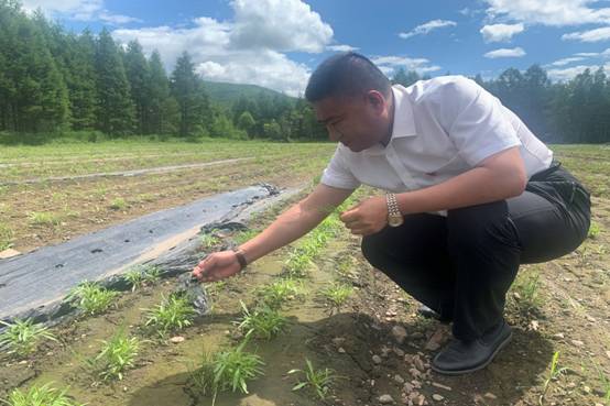 圖為關(guān)成國在古源林場興安雪菊種植基地查看雪菊長勢情況(魏樹強(qiáng)/攝)