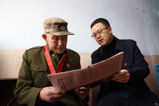 阿木爾林業(yè)局黨委委員、宣傳部部長高樹源(右)走進(jìn)老黨員張俊峰家中,宣傳黨的十九屆六中全會精神(王力攝)