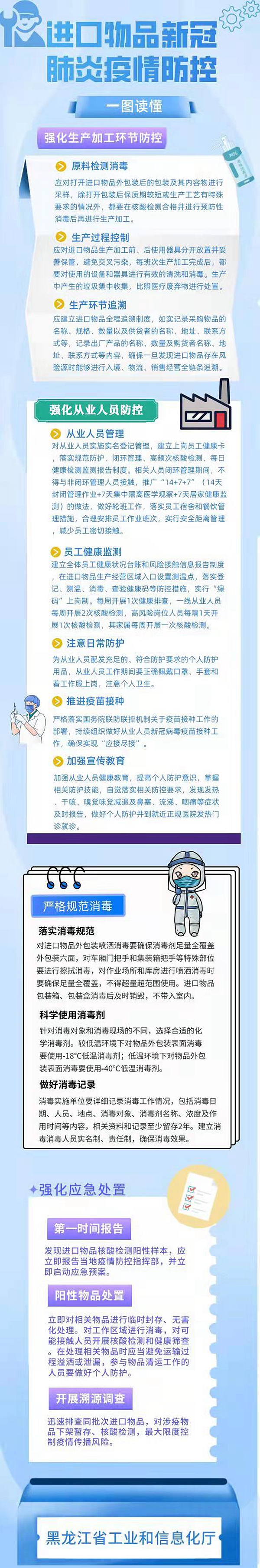 公開信表示,近期疫情反彈形勢(shì)嚴(yán)峻復(fù)雜,為確保工業(yè)企業(yè)不發(fā)生聚集性疫情,共同構(gòu)筑疫情防控堅(jiān)固防線,提示:涉及進(jìn)口物品加工、使用的工業(yè)企業(yè)要嚴(yán)格按照《黑龍江省進(jìn)口物品新冠肺炎疫情風(fēng)險(xiǎn)防控工作方案》落實(shí)各項(xiàng)防疫措施。一要強(qiáng)化生產(chǎn)加工環(huán)節(jié)的防控。生產(chǎn)前做好原料檢測(cè)消毒,生產(chǎn)中做好過程控制,設(shè)備和器具進(jìn)行有效的清洗和消毒避免交叉污染,產(chǎn)生的垃圾集中收集,比照醫(yī)療廢棄物進(jìn)行處置。建立進(jìn)口物品全程追溯制度,確保一旦發(fā)現(xiàn)進(jìn)口物品存在風(fēng)險(xiǎn)源時(shí)能夠進(jìn)行入境、物流、銷售經(jīng)營全鏈條追溯。二要強(qiáng)化從業(yè)人員防控。對(duì)員工實(shí)施實(shí)名登記管理,做好員工健康監(jiān)測(cè)和核酸檢測(cè),合理安排作業(yè)班次,減少密切接觸。配發(fā)充足并符合防護(hù)要求的個(gè)人防護(hù)用品,加強(qiáng)員工健康教育,提高個(gè)人防護(hù)意識(shí)。嚴(yán)格落實(shí)當(dāng)?shù)仃P(guān)于疫苗接種工作的部署,持續(xù)組織做好員工新冠病毒疫苗接種工作,確保實(shí)現(xiàn)“應(yīng)接盡接”。三要嚴(yán)格規(guī)范消毒。對(duì)進(jìn)口物品外包裝、加工場(chǎng)所、車廂門把手和集裝箱把手等要嚴(yán)格按照規(guī)范消毒,消毒時(shí)要確保足量全覆蓋并針對(duì)消毒對(duì)象和消毒現(xiàn)場(chǎng)的不同選擇合適的化學(xué)消毒劑。詳細(xì)記錄消毒工作情況,建立消毒人員實(shí)名制、責(zé)任制,確保消毒效果。四要強(qiáng)化應(yīng)急處置。發(fā)現(xiàn)進(jìn)口物品核酸監(jiān)測(cè)陽性樣本,應(yīng)立即報(bào)告當(dāng)?shù)匾咔榉揽刂笓]部,并同步啟動(dòng)應(yīng)急預(yù)案。對(duì)相關(guān)物品進(jìn)行臨時(shí)封存、無害化處理,對(duì)工作區(qū)域進(jìn)行消毒,對(duì)可能接觸的人員開展核酸檢測(cè)和健康篩查。迅速排查同批次進(jìn)口物品,最大限度控制疫情傳播風(fēng)險(xiǎn)。