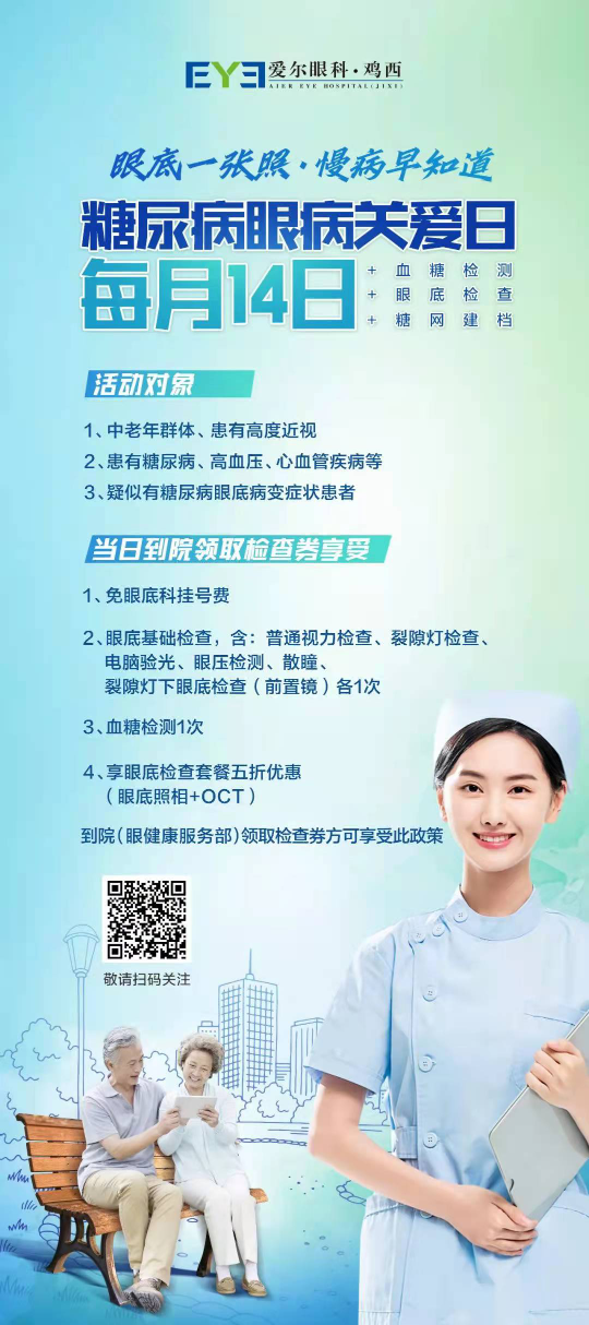 糖尿病作為嚴重的并發(fā)癥糖尿病視網(wǎng)膜病變,已成為成年人致盲的首要原因。為了加強糖尿病患者的宣傳和防治,提高公眾對糖尿病的防控,喚醒人們意識,雞西愛爾眼科醫(yī)院將每月14日定為糖尿病眼病關(guān)愛日。當天在該院就診的患者可享眼底基礎(chǔ)檢查、專家看診、血糖檢測、眼底檢查套餐五折優(yōu)惠等服務(wù),具體以下圖為準。