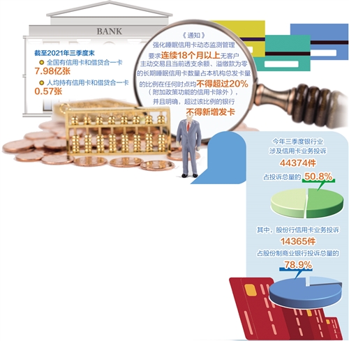 近年來(lái),我國(guó)銀行業(yè)金融機(jī)構(gòu)信用卡業(yè)務(wù)快速發(fā)展,在便利群眾支付和日常消費(fèi)等方面發(fā)揮了重要作用。人民銀行發(fā)布的數(shù)據(jù)顯示,截至2021年三季度末,全國(guó)有信用卡和借貸合一卡7.98億張,人均持有信用卡和借貸合一卡0.57張。發(fā)卡量激增的同時(shí),行業(yè)亂象也被各界詬病,尤其是消費(fèi)者針對(duì)信用卡過(guò)度營(yíng)銷、亂收費(fèi)等問(wèn)題的投訴量近年來(lái)居高不下。