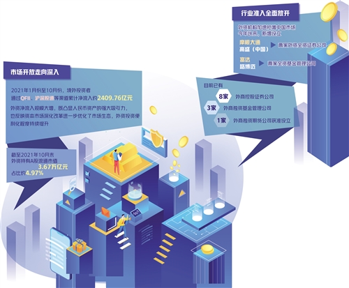一系列開放舉措吸引了外資的高度關(guān)注和認(rèn)可,外資參與中國市場熱情高漲,在華投資展業(yè)活動(dòng)加快推進(jìn)。截至2021年10月末,外資持有A股流通市值3.67萬億元,占比約4.97%。