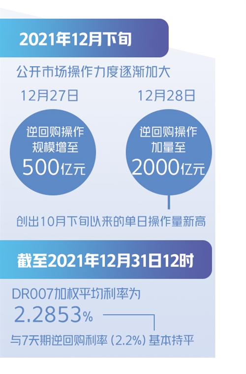 從2021年12月20日開(kāi)始,公開(kāi)市場(chǎng)操作力度就逐漸加大,主要表現(xiàn)為單日逆回購(gòu)操作規(guī)模從之前的100億元增至200億元,并重啟14天期逆回購(gòu)操作,與7天期品種形成搭配。進(jìn)入2021年最后一周,12月27日逆回購(gòu)操作規(guī)模增至500億元,12月28日逆回購(gòu)操作進(jìn)一步加量至2000億元,創(chuàng)出10月下旬以來(lái)的單日操作量新高。