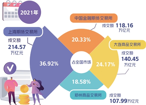 數(shù)據(jù)顯示,上海期貨交易所2021年成交量為24.45億手,成交額為214.57萬億元,同比分別增長14.9%和40.4%,分別占全國市場的32.55%和36.92%。