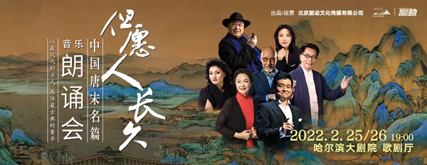 2月25、26日,“但愿人長(zhǎng)久——中國(guó)唐宋名篇音樂朗誦會(huì)”將以全新陣容再度亮相冰城舞臺(tái),由指揮家高嵩執(zhí)棒,黑龍江省歌舞劇院有限公司交響樂團(tuán)、民族樂團(tuán)、合唱團(tuán)共同呈現(xiàn),朗誦表演藝術(shù)家濮存昕、喬榛、張晶、張宏聯(lián)袂著名歌唱家楊小勇、么紅,以詩(shī)樂相伴的方式再現(xiàn)盛唐兩宋的詩(shī)詞歌賦。