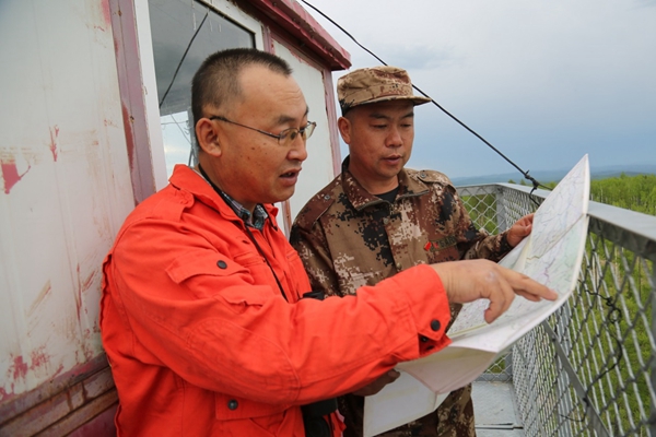 孫立森在向長(zhǎng)山林場(chǎng)黨支部書(shū)記關(guān)大安介紹塔周?chē)牡匦?、地?shì)、河流等特點(diǎn),以及周邊瞭望塔的分布情況(王力 攝)