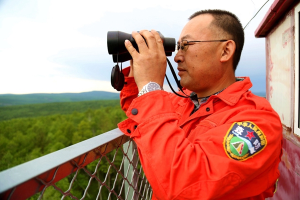 阿木爾林業(yè)局“阿16”防火瞭望塔瞭望員孫立森密切關(guān)注周?chē)仲Y源安全(王力 攝)