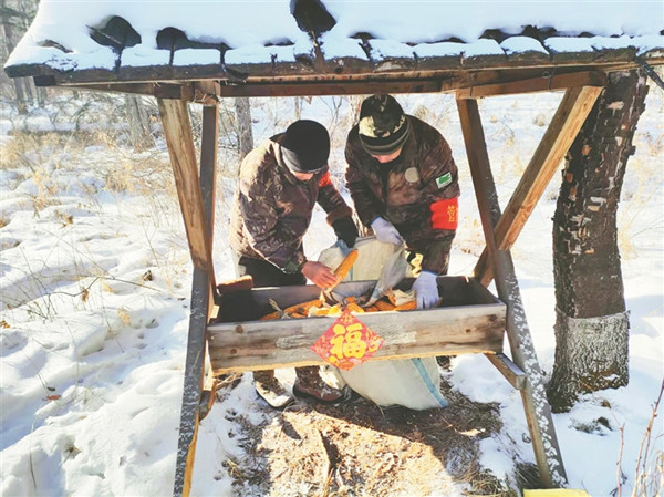 同一時間,青山林場的巡護隊員來到53林班補飼點,貼福字,送“年貨”?!斑@過年了,狍子野豬的食物也得提檔升級。咱們過年吃餃子,它們也得吃點好的?!标爢T王振林邊擺放著玉米、豆餅粉、白菜、蘿卜等食物邊調(diào)侃著。