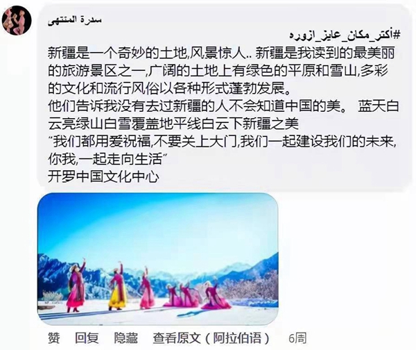 其中,來自埃及曼蘇拉的西德拉·蒙塔哈獲得本次活動的“最佳評論獎”。她在中心帖文下多次留言,“新疆風(fēng)景迷人,是最美的旅游勝地之一。在廣袤的土地上有草原和雪山,沒有去過新疆的人,就不會知道中國的美……我想去那里滑雪、騎馬?!绷硗?,她還想去北京吃炸醬面,去遼寧泡溫泉等。