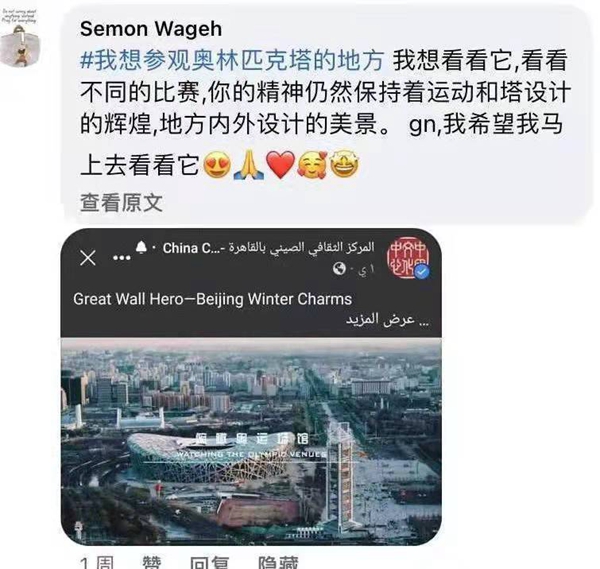2022年年初,根據(jù)埃及社會、文化特點(diǎn)和民眾喜好,開羅中國文化中心創(chuàng)新推出了2022“北方冰雪旅游海外推廣季”之“我最想去的地方”線上評選活動,邀請埃及各界友人參與話題互動,在中心主題帖文下寫出自己最想去的中國省份(或城市)及原因,曬出旅游目的地圖片并打上話題標(biāo)簽等?;顒右唤?jīng)推出,即受到埃及民眾的廣泛關(guān)注,網(wǎng)友們紛紛在中心臉書帖文下留言并轉(zhuǎn)發(fā),評選自己“最想去的中國冰雪旅游勝地”,并熱情附上自己之前在華留學(xué)、訪問、旅游、生活的旅游體驗(yàn)和文化閱歷,活動二次外溢效應(yīng)明顯,二次傳播效果良好,旅游推廣和文化傳播的效果遠(yuǎn)遠(yuǎn)高于預(yù)期?;顒悠陂g,該活動