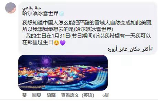 開羅中國文化中心臉書主頁超級粉絲艾曼·索比、曼娜·伊薩姆和羅飛三位網(wǎng)友獲得了優(yōu)秀評論獎。艾曼·索比在留言中提出想去黑龍江大慶泡雪地溫泉;曼娜·伊薩姆在評論里說她想去哈爾濱極地公園游玩,想去牡丹江鏡泊湖的冰瀑跳水,想去吉林的查干湖看看;羅飛表示想到哈爾濱冰雪大世界去過生日。眾多網(wǎng)友也紛紛曬出了自己最想去的地方,新聞與媒體從業(yè)者加達(dá)·阿里想先去遼寧的滑雪場,然后再去采摘丹東的草莓;來自明亞省的緒瑪·穆斯塔法表示想去內(nèi)蒙古東方冰雪小城阿爾山旅游;畢業(yè)于蘇哈格大學(xué)的薩蒙·瓦赫想去北京看奧林匹克塔等。網(wǎng)友們各抒己見,暢想去中國的夢幻旅程。