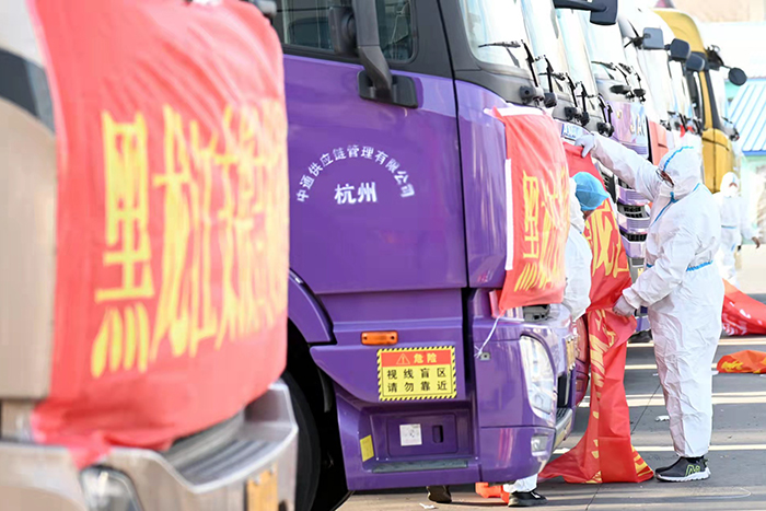 為了保障此次物資運送順利、安全,所有車輛及人員全部實行閉環(huán)管理,途中不經(jīng)過市區(qū),安排警車引導,運送物資車輛原則上直接抵達吉林省外接卸點,不與吉林省工作人員直接接觸,無接觸傳遞完成物資交接后,立即對車輛進行全面消毒。
