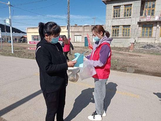 新林林業(yè)局大烏蘇林場“林海流星雨”志愿服務(wù)隊隊員在向居民發(fā)放防火宣傳單(劉志剛 攝)