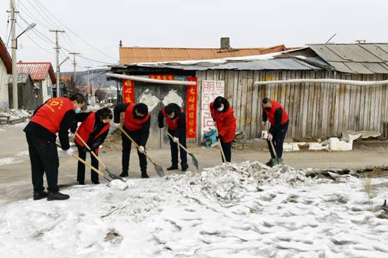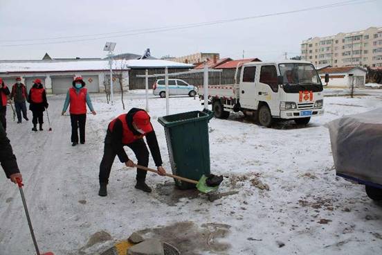 新林林業(yè)局機(jī)關(guān)科室“林海流星雨”志愿服務(wù)隊在居民區(qū)清掃積雪(崔紅霞 攝)