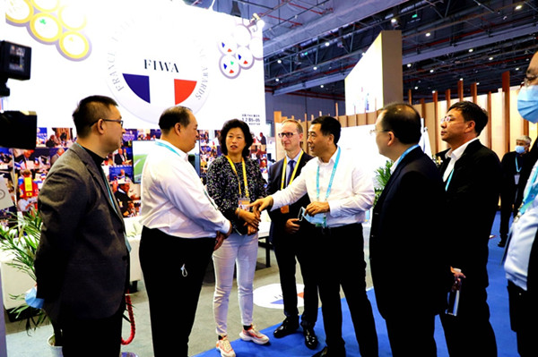 阿木爾林業(yè)局北極冰藍(lán)莓酒莊生產(chǎn)的冰酒、紅酒等產(chǎn)品,在第四屆上海國際進(jìn)出口博覽會(huì)上展出。大興安嶺林業(yè)集團(tuán)公司黨委副書記、總經(jīng)理李軍(左五)與國際友人及林業(yè)局參展人員親切交談,了解酒莊產(chǎn)品特點(diǎn)、市場營銷等情況(王力 攝)