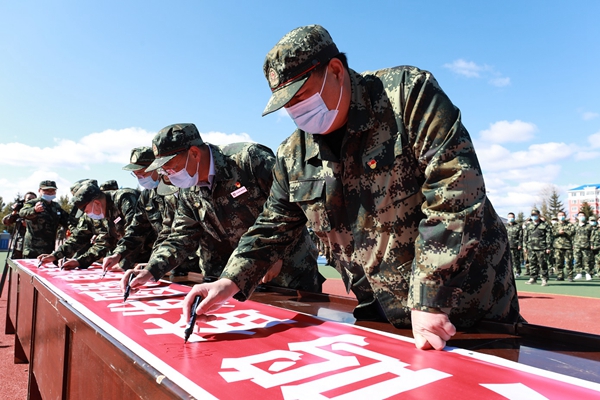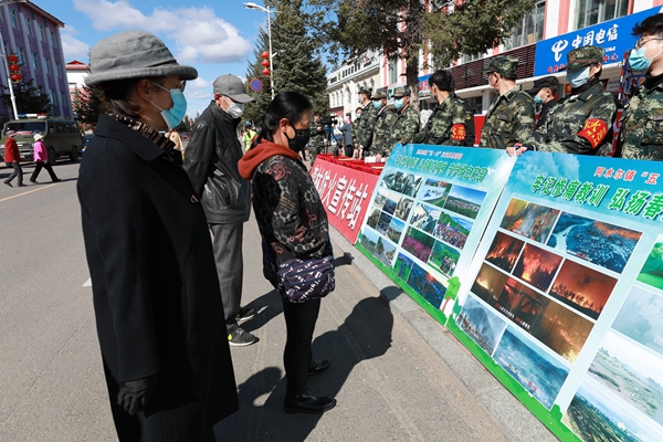 阿木爾林業(yè)局處級領導在印有“牢記歷史 警鐘長鳴 奮發(fā)圖強 建設美麗家園”的宣傳條幅上簽名(王力 攝)