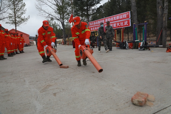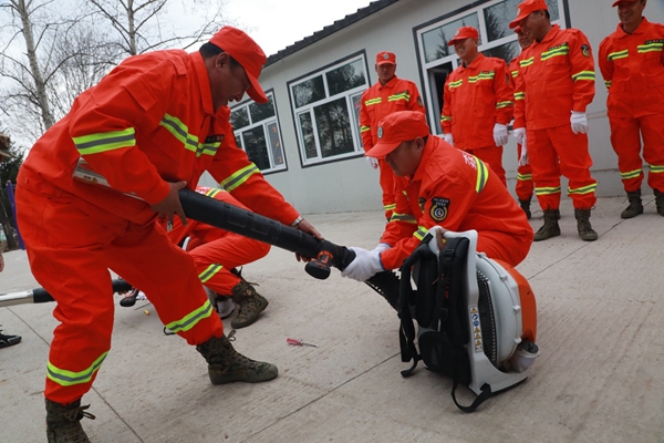 阿木爾林業(yè)局依東林場專業(yè)撲火隊員在進(jìn)行拆解安裝風(fēng)力滅火機比賽(王力 攝)