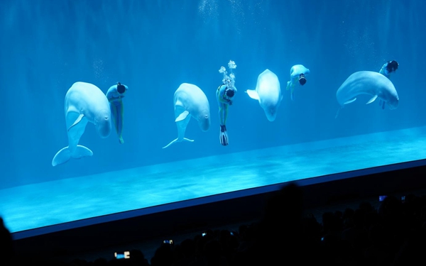 極地公園工作人員介紹,四鯨、四人共同表演難度很大,這樣一場震撼無比的表演,離不開白鯨寶貝們的高智商和高情商,以及白鯨和馴養(yǎng)師朝夕相處的和諧和默契。這場四鯨秀不僅內(nèi)容新,這四只白鯨也是第一次“組團(tuán)”,它們沒有任何緊張和怯場,超具藝術(shù)家風(fēng)范,最后還不忘集體謝幕,贏得了游客接連不斷的喝彩和掌聲。為了打造世界最好的白鯨表演,哈爾濱極地公園的白鯨劇場從場館設(shè)計(jì)、音樂編排、燈光音響設(shè)備,到巨型展窗等均做到國內(nèi)頂級,只為全方位打造世界最好的白鯨秀。