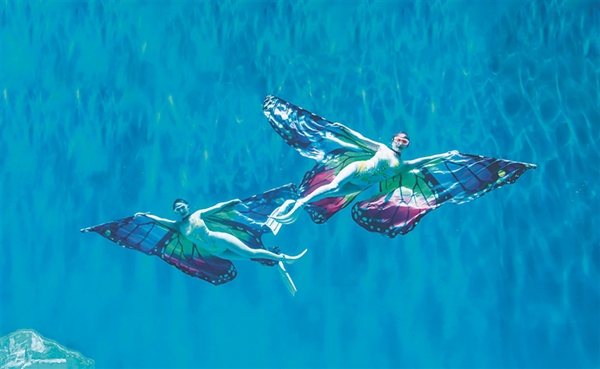 哈爾濱極地公園的水舞秀表演會聚國內(nèi)頂級水舞表演藝術(shù)家,汲取花樣游泳、芭蕾舞、形體藝術(shù)的精華。演員不僅需要克服6米深海水的巨大浮力,還要克服相當(dāng)于陸地上12倍的巨大阻力,在0.5秒內(nèi)展開4米長的巨大蝴蝶羽翼,閉氣空潛3分鐘,完成一系列“蝶舞”動作,難度極高!炫彩的羽翼、波光粼粼的海水、五彩斑斕的魚兒融合在一起,美輪美奐。