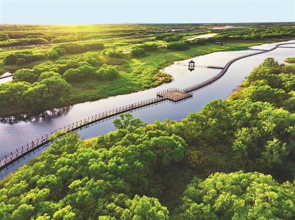在黑瞎子島濕地公園,登上全景平臺,游客可以一覽濕地全貌,體會親水、親綠、親近自然的愜意。2256米的漂浮式木棧道九曲回廊,浮筒的設(shè)計(jì)使浮橋水漲橋漲、水降橋降。