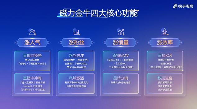 本次活動,快手磁力金牛和快手電商服務(wù)商也宣布推出一系列政策,推動常熟女裝商家電商生意增長。作為電商生意的加速器,快手磁力金牛讓商家投流更精準(zhǔn)、效率更高、效果更好。在賬號啟動期,商家可借助磁力金牛進行私域起量,并根據(jù)貨盤制定營銷策略;在賬號成長期,商家可依據(jù)S-A-B直播策略模型,使用磁力金牛進行差異化投流、精細化運營;在賬號成熟期,磁力金??梢栽谄沸f(xié)同下進行差異化拓客,引入新流量。