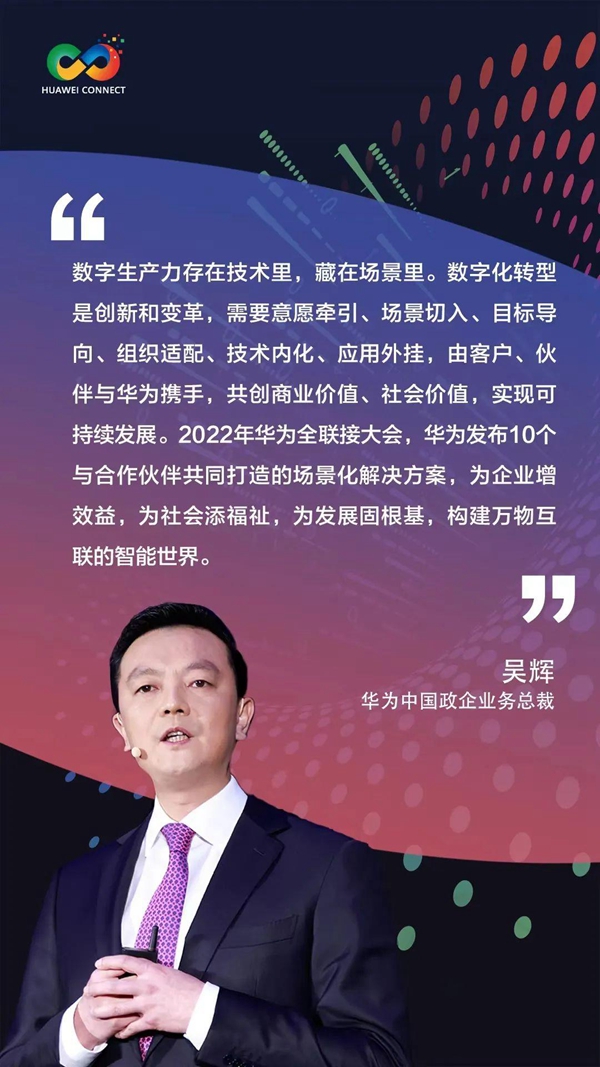 當(dāng)前,我國的數(shù)字化已經(jīng)進(jìn)入快車道,釋放數(shù)字生產(chǎn)力正當(dāng)其時。而“數(shù)字生產(chǎn)力就存在技術(shù)里,藏在場景里。”基于此,華為中國政企業(yè)務(wù)總裁吳輝在會上發(fā)表了題為《為行業(yè)找技術(shù),深入場景創(chuàng)造價值》的主題演講,重點(diǎn)分享了華為基于多年的探索和實踐總結(jié)出的行業(yè)數(shù)字化轉(zhuǎn)型的方法論和企業(yè)轉(zhuǎn)型成功秘訣。