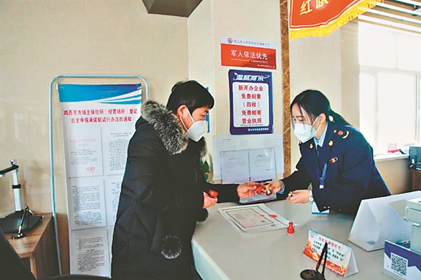 密山市市場監(jiān)督管理局政務(wù)服務(wù)窗口工作人員將免費(fèi)刻制的四枚印章送給客商。