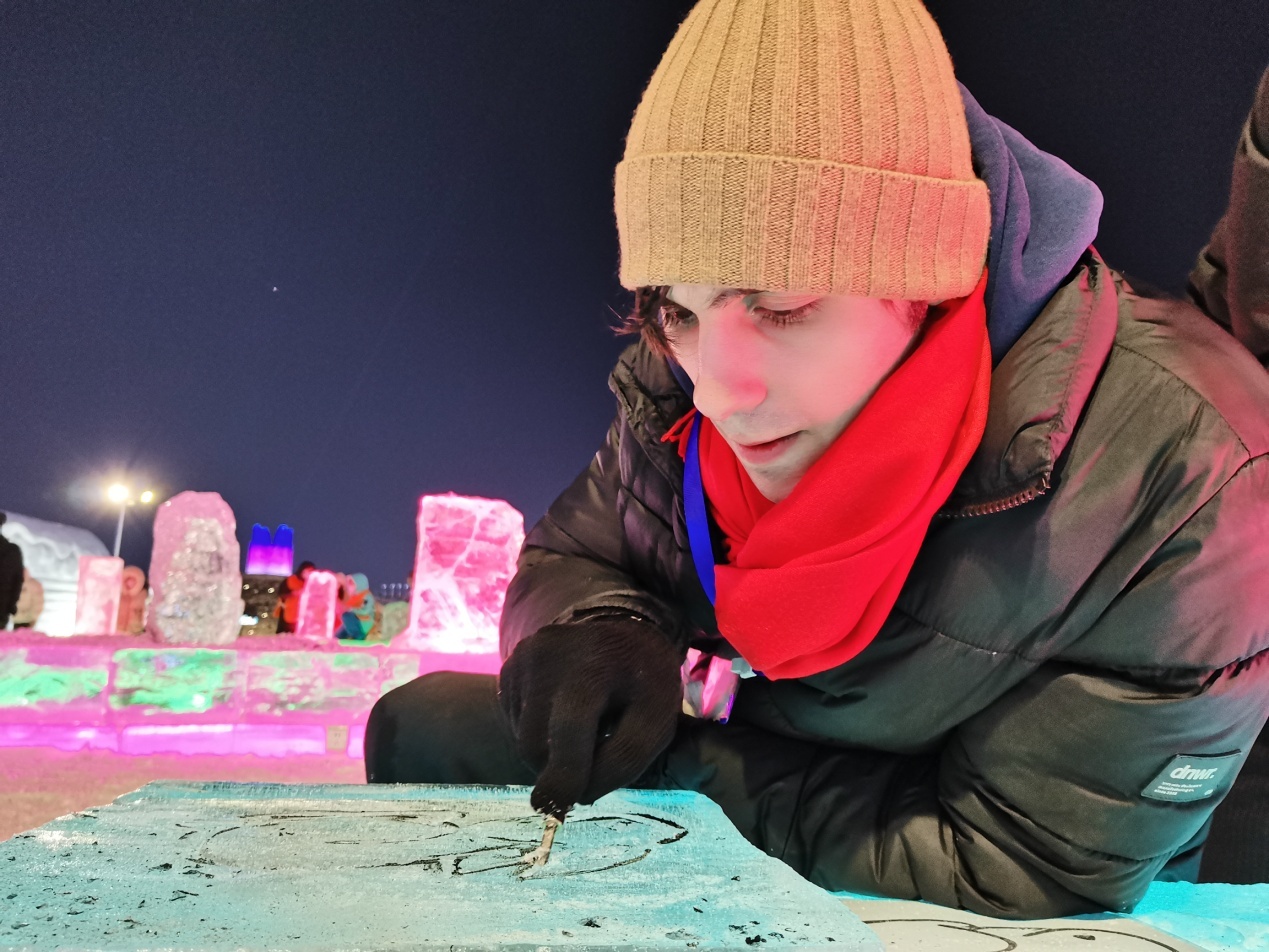 傍晚,中外青少年在流光溢彩、美輪美奐的哈爾濱冰雪大世界中感知冰雪藝術(shù)的魅力。在冰雪藝術(shù)體驗營聆聽冰雕制作過程,學(xué)習(xí)將冰與中國傳統(tǒng)木刻版畫相結(jié)合,親手設(shè)計制作屬于自己獨一無二的冰版畫,體驗冰雪帶來的樂趣。