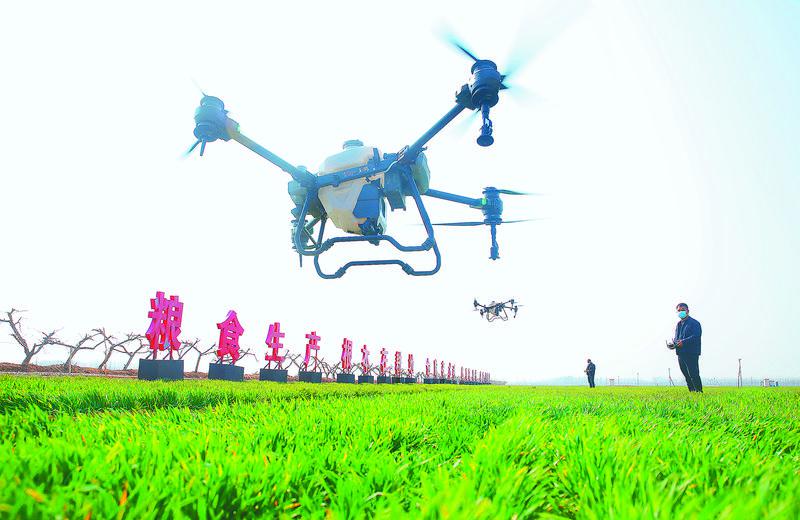 3月1日,鶴壁市浚縣王莊鎮(zhèn)小灘村,種糧大戶魏方月的2000畝小麥喝上了“返青水”,同時,無人機在空中施肥,播撒均勻效率還高。