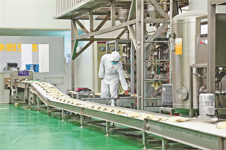 農(nóng)墾龍王食品公司車間的生產(chǎn)線正開足馬力運轉(zhuǎn)。本報記者 張翎攝