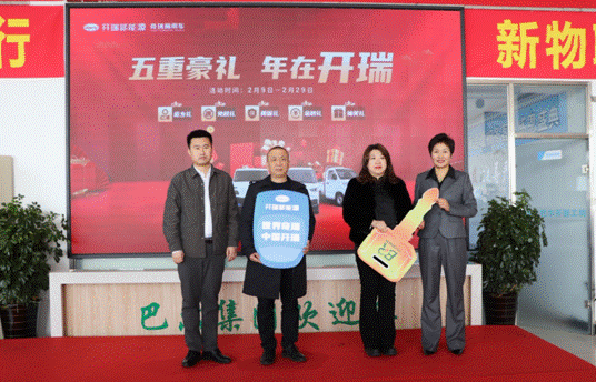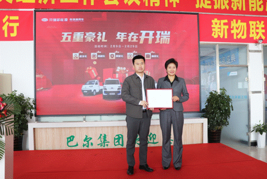 開瑞新能源汽車有限公司北部戰(zhàn)區(qū)總監(jiān)王培山向巴爾新能源總經理徐娟頒發(fā)省總代理授權書