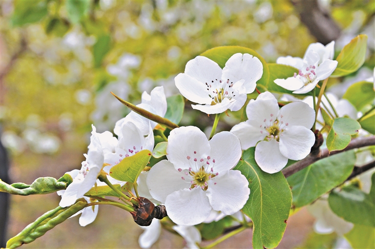 一場(chǎng)小雨過(guò)后,花瓣上、樹(shù)葉上一滴滴晶瑩剔透的水珠給梨樹(shù)增添了幾分韻味,梨花帶雨,讓人又憐又喜。漫步梨園,樹(shù)上朵朵梨花如雪,地面蒲公英花金黃,頭頂是湛藍(lán)的天空和朵朵白云,一只只繁忙的小蜜蜂在花間“起舞”。漫步其中,仿佛游走于一幅畫(huà)卷中,讓人只想留住這美麗的瞬間。