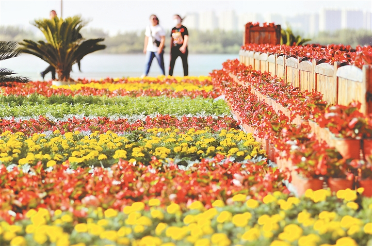 5月21日,哈爾濱市道外區(qū)江畔景陽廣場上,數(shù)千株五顏六色的花卉構(gòu)成了一座美麗的大花壇,有黃色的菊花、紅色的四季海棠、白色的雪葉蓮等,姹紫嫣紅,爭奇斗艷,將廣場裝點(diǎn)得分外美麗,吸引了許多市民、游客駐足觀賞拍照。