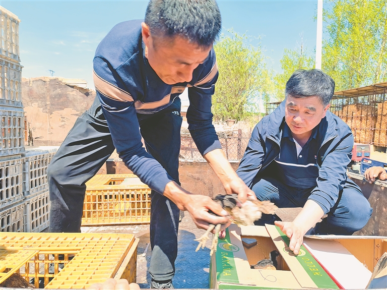 駐村工作隊(duì)將捐贈(zèng)的濱麻雞雞雛送到農(nóng)戶手中。本報(bào)記者 白云峰攝