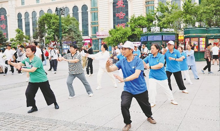 在哈爾濱建筑藝術廣場上,可以看到來自各地的游人正在打卡拍照,來自青島的老年旅游團還在此打起了太極拳。據同程旅行發(fā)布的《2024暑運出行趨勢報告》,自6月份以來,哈爾濱成為這個暑期熱門避暑目的地,6月中旬開始,黑龍江的人氣快速上升。本報記者 張澍攝