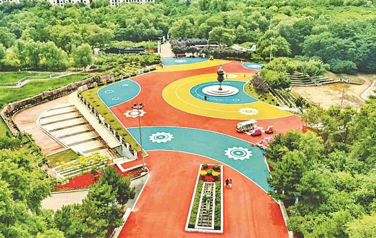 公園內(nèi)4000多平方米的休閑廣場,經(jīng)過改造、彩化,呈現(xiàn)出全新的面貌,孩子們在上面騎車、奔跑。彩色廣場將工業(yè)主題元素融入設(shè)計(jì)理念,與周圍的景觀小品相得益彰。