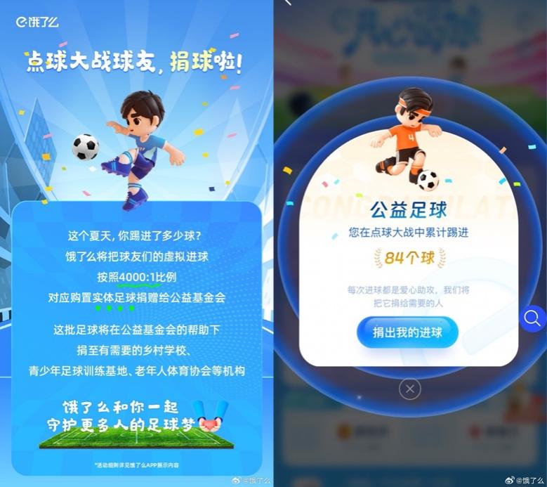 在西班牙隊(duì)球迷的歡呼聲中歐洲杯正式落幕,隨之結(jié)束的還有餓了么足球季活動(dòng)。7月15日當(dāng)天,餓了么官宣上線足球捐贈(zèng)活動(dòng),所有用戶都可以選擇捐贈(zèng)這一個(gè)月來在“點(diǎn)球大戰(zhàn)”游戲中累積的虛擬進(jìn)球,餓了么將聯(lián)合公益基金會(huì),按照比例對應(yīng)捐贈(zèng)實(shí)物足球給到有需要的鄉(xiāng)村學(xué)校、青少年足球訓(xùn)練基地、老年人體育協(xié)會(huì)等,和用戶一起把今夏開心傳遞給更多人。