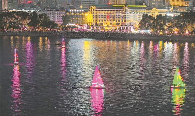 近日,松花江哈爾濱市道里區(qū)防洪勝利紀(jì)念塔江段,每晚都會有多艘靚麗的彩色帆船巡游表演。十幾艘白色帆船船身上變幻的4D彩飾燈,仿佛披著斑斕的霓裳,光影暈染在波光粼粼的江面,形成一道道淺淺的虹,讓夏夜的松花江愈顯美麗動人。這是哈爾濱市總工會組織的職工帆船表演隊,每艘帆船上安裝有百米長燈帶、小型發(fā)電機(jī)和微電腦,形成4D燈光秀效果,每天9時30分至11時、19時30分至21時表演。