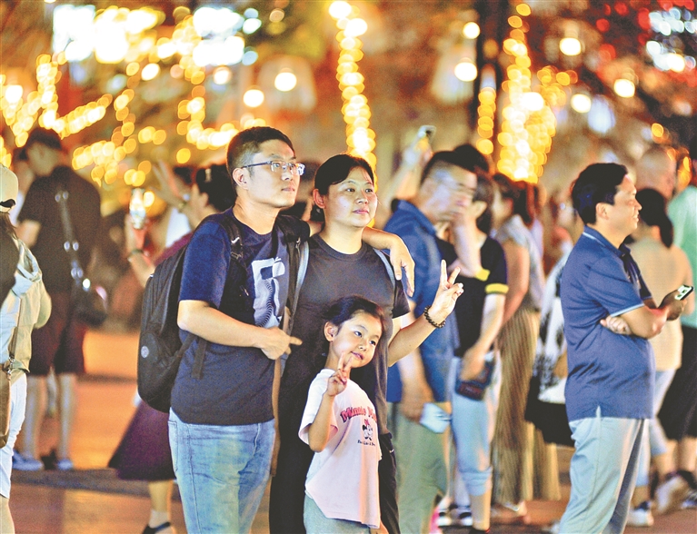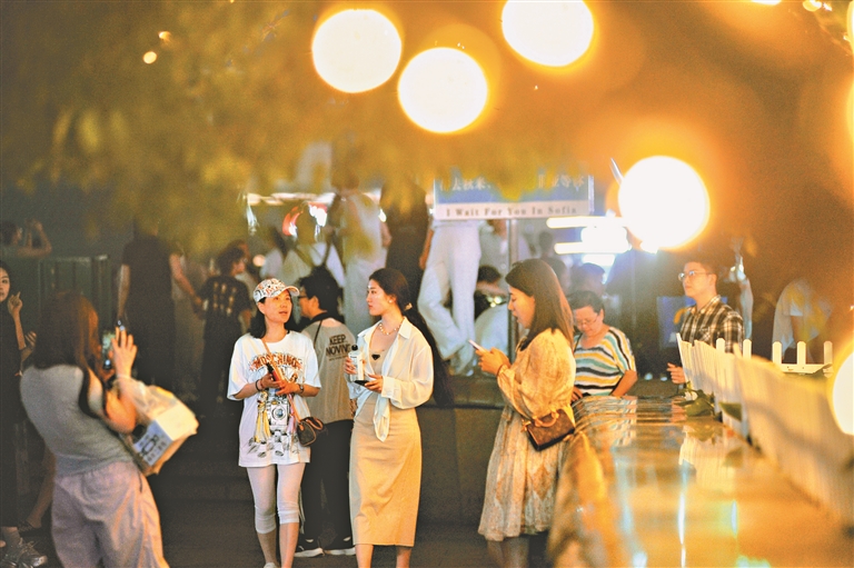 冰城夏夜,涼爽宜人,哈爾濱建筑藝術(shù)廣場上人來人往,非常熱鬧。許多游客在觀賞美景,享受清涼。廣場周邊的樹木、水池等處安裝了美麗的燈飾,夜幕降臨這些彩燈紛紛點亮,勾勒出一個迷人的夜晚。一位湖南游客說,上午就來參觀過,晚上又來了,很涼快,風景也很美,拍攝了很多好看的圖片發(fā)到朋友圈,親友們紛紛點贊。