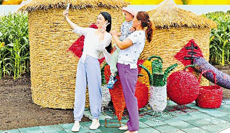 游客在稻草編織藝術(shù)品前打卡拍照。裴文彬攝