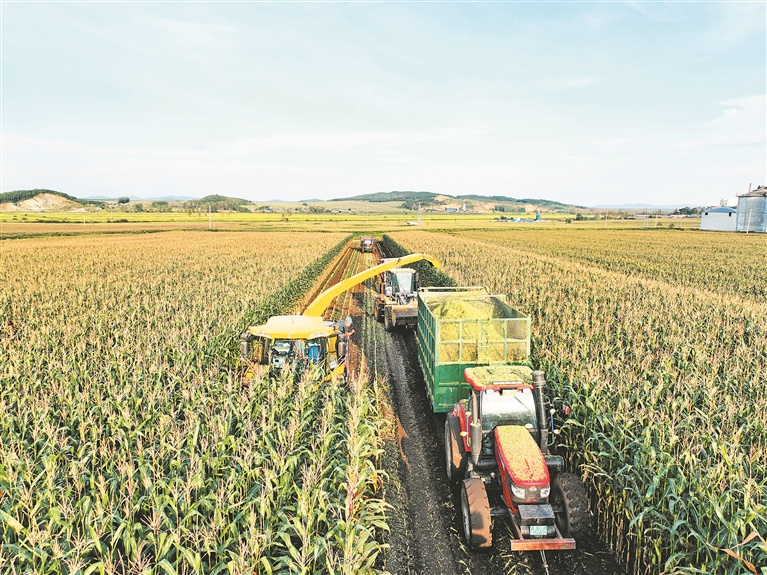 本報訊(崔倫震 記者劉暢)8月28日,在北大荒集團黑龍江八五一一農(nóng)場有限公司第二管理區(qū)青貯玉米地塊,一臺大型青貯玉米收割機正在進行收獲作業(yè),滿載青貯玉米的大馬力拖拉機一輛又一輛交替轉(zhuǎn)運,井然有序,一派繁忙的豐收景象。
